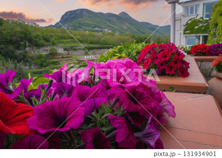 Blooming purple and red petunias in terracotta planters, lush green hills, terraced landscapes, and a white ivy covered building at sunset in Amalfi.