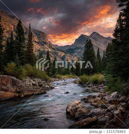 Majestic mountain landscapes at sunset, featuring a rocky river flowing through a forest with pine trees and large boulders.