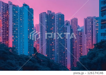 A Vibrant Urban Sunset Over Skyscrapers in Hong Kong