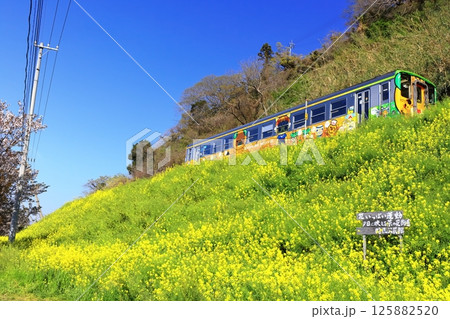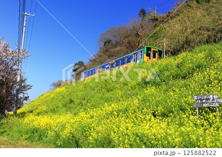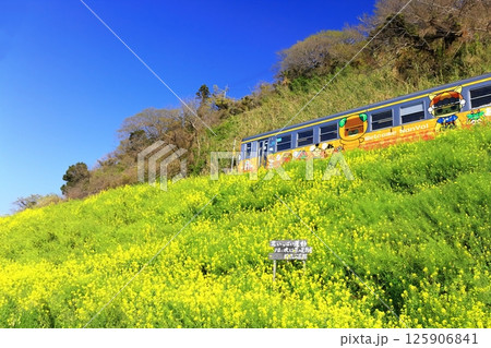 【愛媛県】快晴下の閏住の菜の花畑と列車