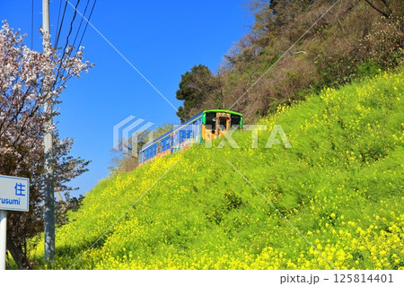 【愛媛県】快晴の閏住の菜の花畑と満開の桜と列車