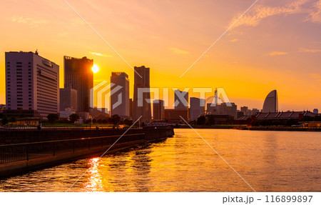 象の鼻防波堤方面から望む 横浜みなとみらいの夕日