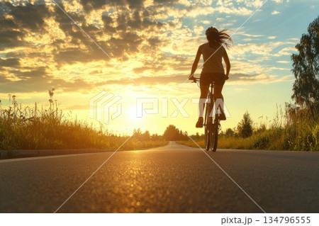 Young woman riding bicycle along empty coastal road at sunset with dramatic sky