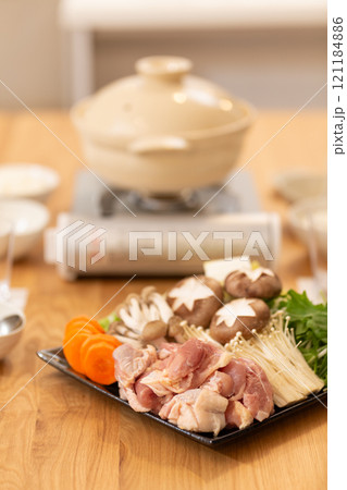冬の夜の食卓に並ぶ鍋料理の食材と土鍋