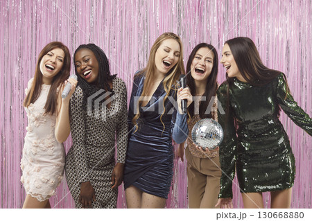 Female friends party together singing into microphones, women laughing, having fun, disco ball