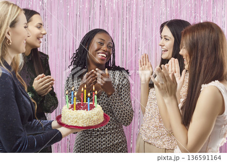 Happy friends celebrating birthday day, group women clapping, african american woman smiling looking