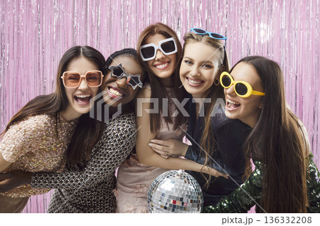 Happy women friends laughing and smiling, wearing party dresses and glasses, posing together