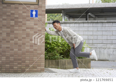 公衆トイレから出てきたミドル男性 ライフスタイルイメージ
