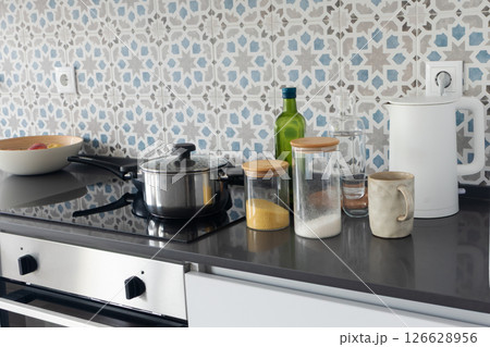 Real home kitchen countertop in Mediterranean style. Concept everyday life, healthy cooking