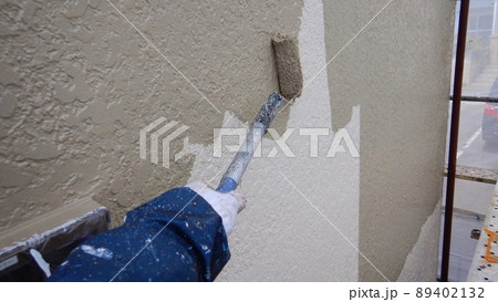 ローラーで戸建て住宅の外壁を塗る塗装職人の手元
