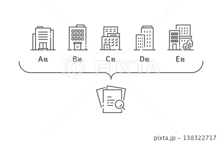 複数社の競合調査やコンペ比較を表すベクターイラスト(線画・モノクロ)