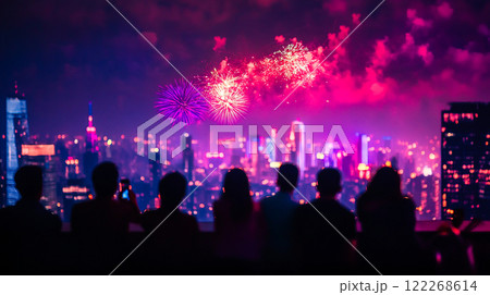 Silhouettes of people standing on a balcony terrace of a skyscraper overlooking the metropolis and watching the fireworks flashes in the night sky.