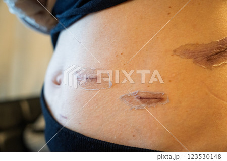 外科手術後の傷跡の経過 ― 腹部の皮膚再生と傷痕ケアのメディカルイメージ