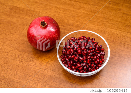 ザクロの果実とボウルに中身を盛ったザクロの種皮 イメージ 木目テーブル