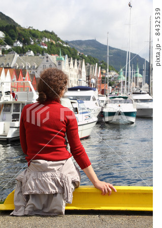 Back of woman sitting on quay in dock with boats in coastal Berg
