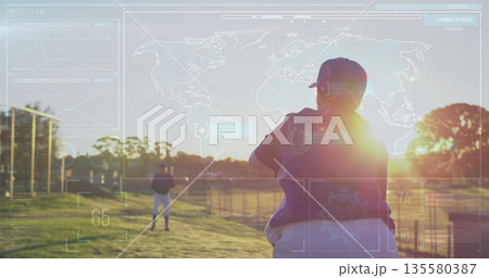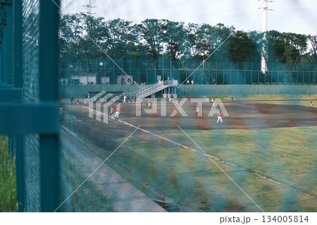 黄昏時の野球場とプレーする選手たち(フェンス越し)