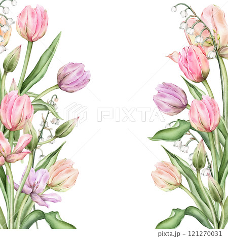 Square Frame with pastel pink light yellow violet Tulips and white lily of the valley. Hand drawn watercolor illustration delicate perennial bulbous flower for wedding design or spring card isolated.
