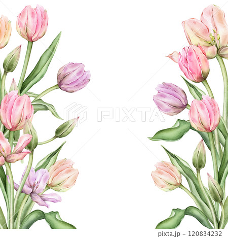 Square Frame with pastel pink light yellow violet Tulips and open bud. Hand drawn watercolor illustration delicate perennial bulbous flower for wedding design or spring card isolated on background.