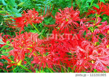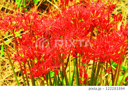 真っ赤なヒガンバナが満開の風景
