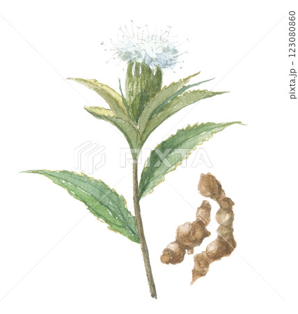 水彩で描いたホソバオケラの花と根 ソウジュツ