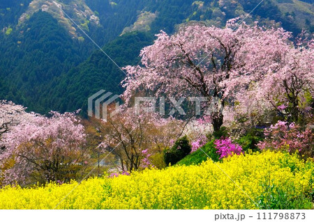 東京西部の枝垂れ桜と満開の菜の花の競演