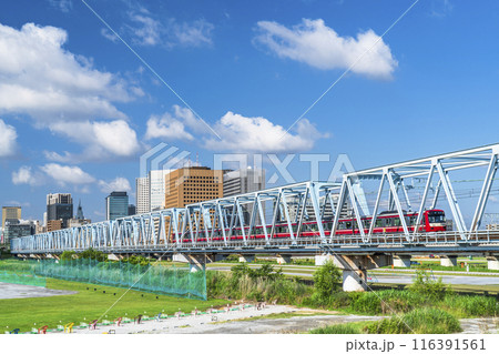多摩川を渡る電車と川崎駅前のビル群の風景【神奈川県・川崎市-東京都・大田区】