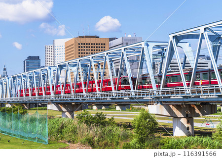 川崎の都市風景 多摩川を渡る京急線の電車と川崎駅前のビル群【神奈川県・川崎市】