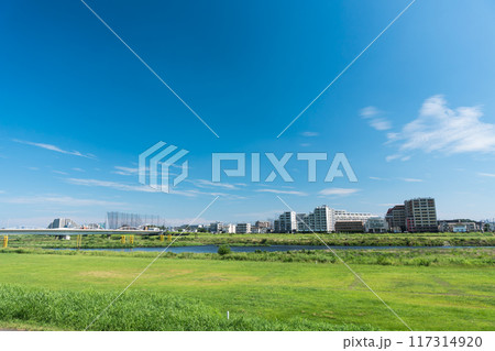 川崎の多摩川の土手から東京都調布市方面を眺める 草原 夏の快晴 神奈川県川崎市