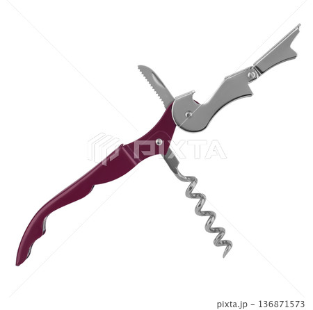 Multipurpose knife. Opened sommeliers knife with corkscrew and bottle opener, waiter's knife professional, isolated on white background. Knife for opening wine. Realistic 3d vector illustration.