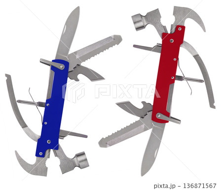 Unfolded multitool on a white background. Pliers in multitool isolated on white background.