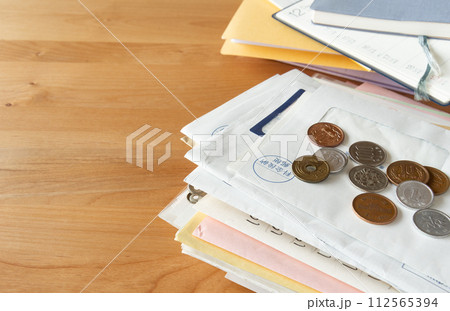 溜まった書類や郵便物で雑然とした机 散らかった机 散乱