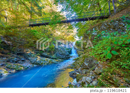 秋の長野県茅野市の多留姫の滝(たるひめのたき)に架かる柳影橋