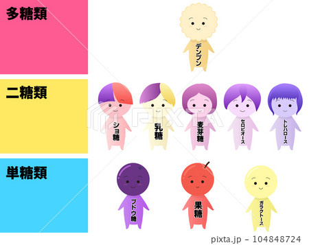 糖類のキャラクター素材セット デンプン ショ糖 乳糖 麦芽糖 ブドウ糖 果糖 ガラクトース