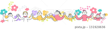 手つなぎ一列に並ぶ多様な人々 人と人のつながり・協力のイメージ