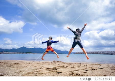 <素材>海へ泳ぎにきて元気いっぱいの兄弟