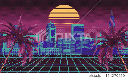 Pixel city background with palm trees. 8 bit retro background. Mosaic background of a town panorama. 80s, 90s style.