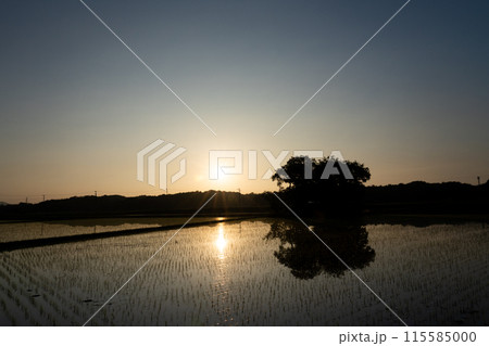田植直後の水田の夜明け風景
