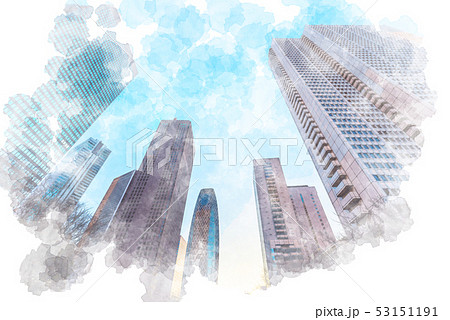 夜明け直後の新宿のビル群 水彩画風