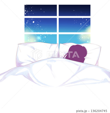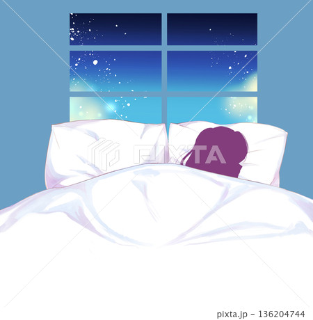 ダブルベッドでひとりで眠る女性 シルエット 窓