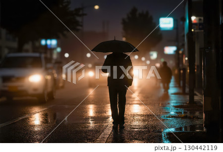 Silhouette of lonely man with umbrella walking on wet city street at night with bright car headlights in background