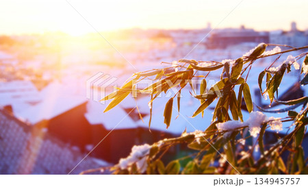 朝露に差し込む光「木々がそびえる家のベランダ」