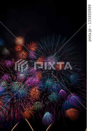 夜空に広がるカラフルな花火の一斉打ち上げ