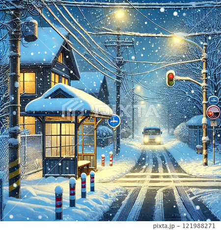 雪に包まれた冬の街角 | 温かみのあるバス停と家々の風景
