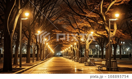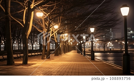 冬の夜の道、街灯と歩道の風景、AI生成画像
