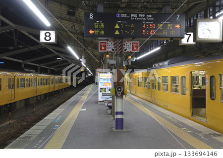 AM4時:早朝の福山駅福塩線ホームから発車待ちの山陽本線115系電車