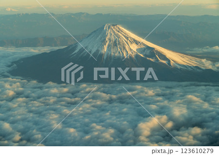 富士山フライトでの朝日のあたった冬の富士山(空撮)