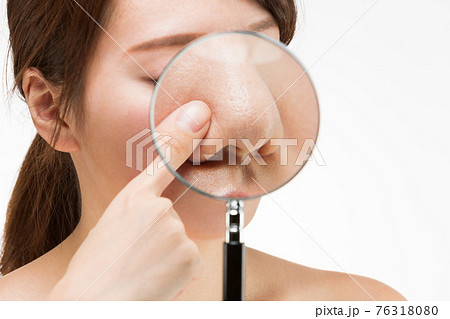 ルーペで女性の鼻を拡大している。