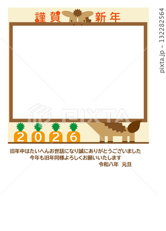 かわいいウマが大きな口を開けている午年フォトフレーム年賀状テンプレート素材