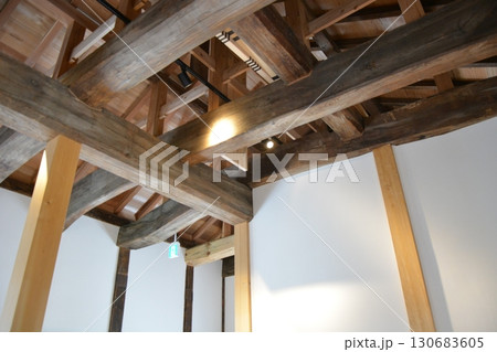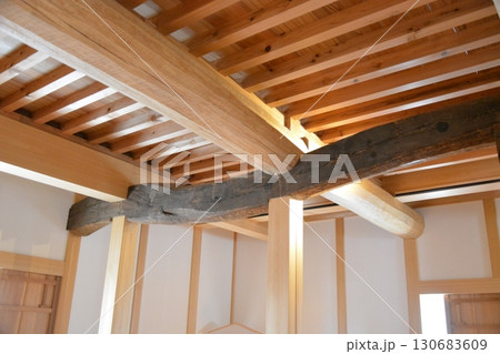 Ancient style castle walls in Japan, made of wood and large stones assembled together.