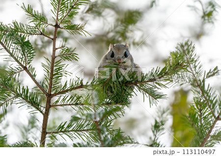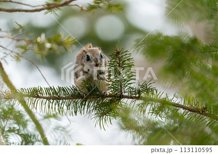 明るい時刻に松の木陰で餌を食べるエゾモモンガ